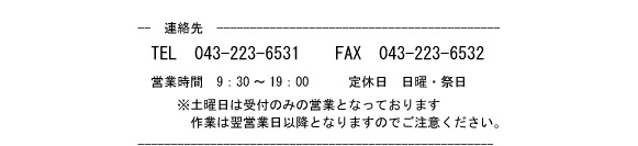 〒260-0015千葉市中央区富士見2−3−1塚本大千葉ビル4階 TEL:043-223-6531FAX:043-223-6532 【営業時間】9:30〜19:00(日祝日・年末年始・休館日除く)※土曜日はセルフサービス及び受付のみの営業です。